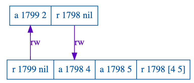In this counterexample, there are two list objects, here named 1799 and 1798, which I’m going to call x and y. The examples use two list operations, append (denoted "a") and read (denoted "r").