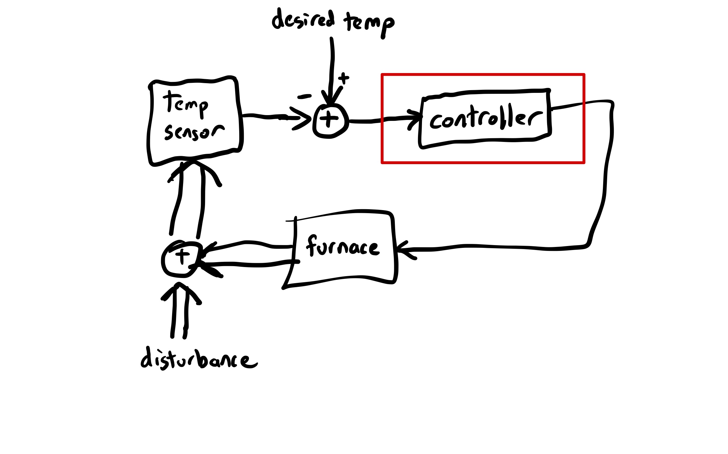 The actual temperature in the house is determined both by the output of the furnace, and by other factors (e.g., temperature outside, how good the insulation is, whether someone has opened a door), which I’ve labeled disturbance.