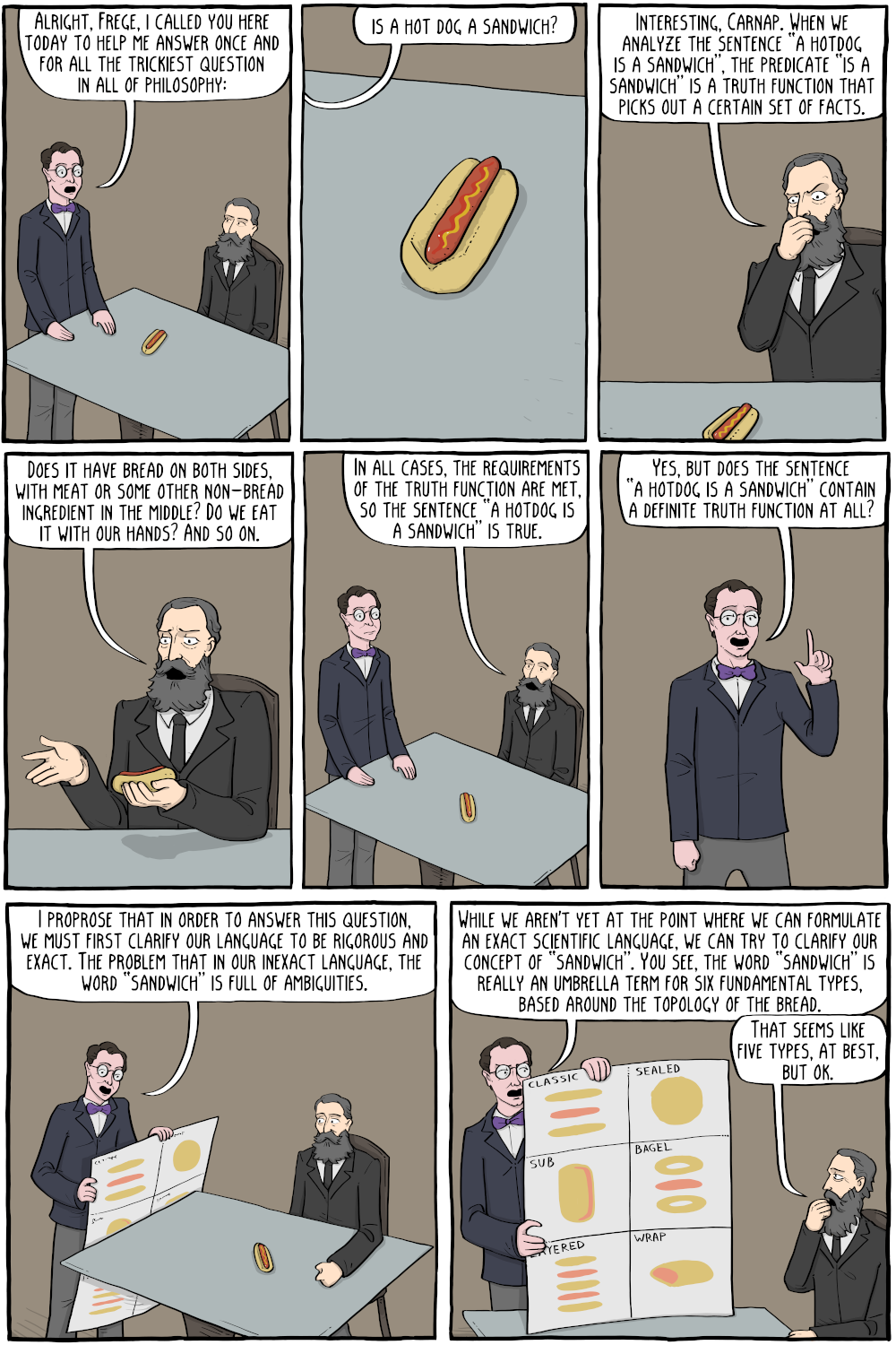 Existential Comics is an extremely nerdy webcomic about philosophers, written and drawn by Corey Mohler, a software engineer(!). My favorite Existential Comics strip is titled Is a Hotdog a Sandwich? A Definitive Study. The topic is… exactly what you would expect: