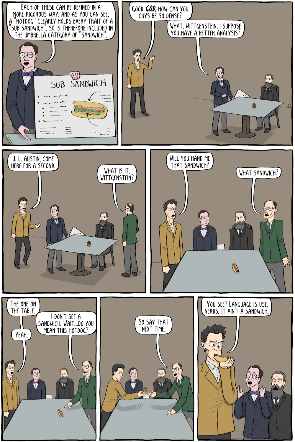 At the risk of explaining a joke: the punchline is that we can conclude that a hotdog isn’t a sandwich because people don’t generally refer to hotdogs as sandwiches. In Wittgenstein’s view, the meaning of a phrase isn’t determined by a set of formal criteria. Instead, language is use.