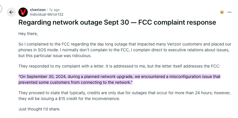 Verizon also suffered from a network outage back in September 30, 2024. Although the FCC acknowledged the outage, I couldn’t find any information from either Verizon or the FCC about the incident. The only information I was able to find about that outage comes from, of all places, a Reddit post. And it also mentions… planned maintenance!