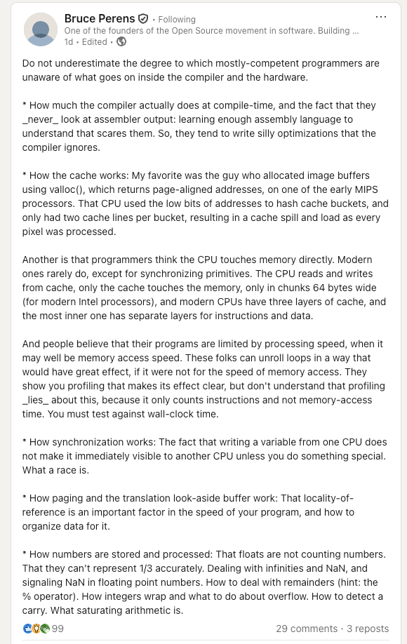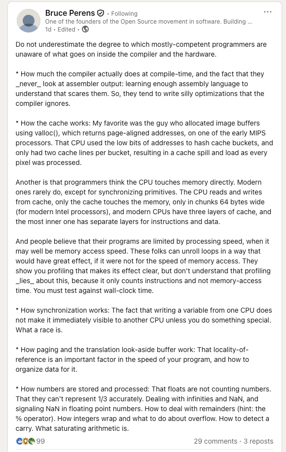 Perens is right that the scenario that Wardley fears has, in some sense, already come to pass. Modern CPU architectures and operating systems contain significant complexity, and many software developers are blissfully unaware of how these things really work. Yes, they have mental models of how the system below them works, but those mental models are incorrect in fundamental ways.