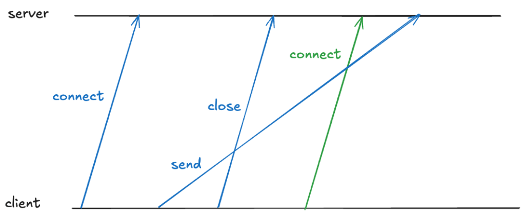 Because TCP packets can arrive out of order, there might still be packets in-flight associated with that connection. If a new TCP connection with the same four-tuple is opened, the receiver will incorrectly associate the packet with the new connection, even though it was part of the old one, as depicted below (here I’m simplifying the connect and close to a single packet rather than using three packets).