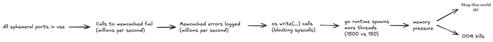 - The ephemeral port exhaustion led to error messages when attempting to call memcached.