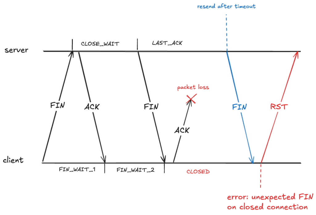 Here the client has received a packet associated with a TCP connection that has transitioned to the CLOSED state. The client will treat this as an error, and will send an RST packet (if you’ve ever seen the message: connection reset by peer, you’ve been on the receiving end of an RST packet).