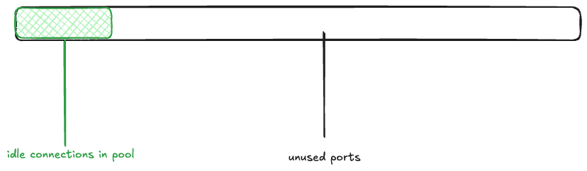 Returning to the Bluesky scenario, imagine that the memcached connection pool is fully populated (there are 1000 idle connections ready to be used), and the rest of the ephemeral ports are free. I’ll depict the space of 28,232 ephemeral ports as a rectangle, with the green rectangle indicating the connection pool.