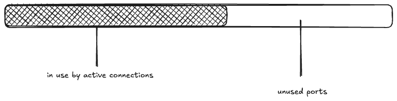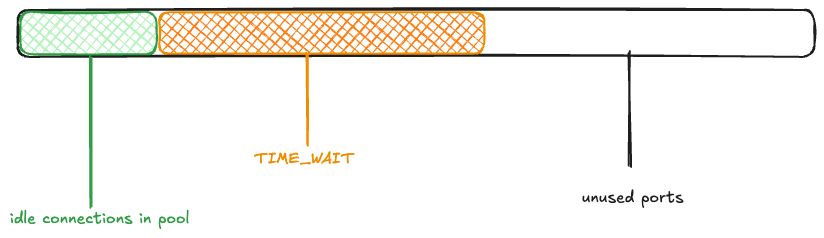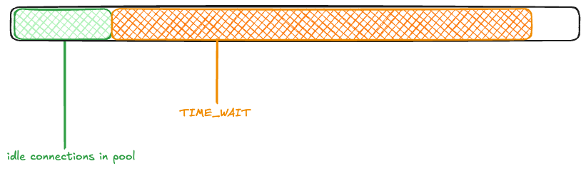 Returning to the Bluesky scenario, imagine that the memcached connection pool is fully populated (there are 1000 idle connections ready to be used), and the rest of the ephemeral ports are free. I’ll depict the space of 28,232 ephemeral ports as a rectangle, with the green rectangle indicating the connection pool.