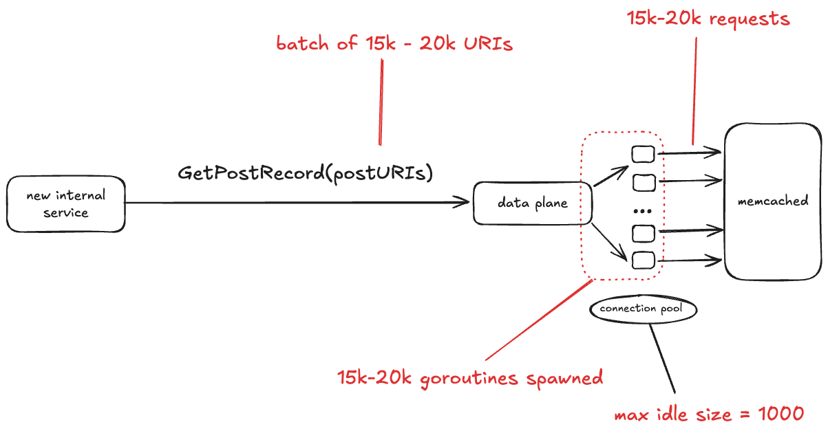 Bluesky recently brought up a new internal service. One of the things this service does is make the GetPostRecord RPC call against the data plane service. The problem isn’t with the rate of traffic. In fact, the volume of traffic that this internal service sends to data plane is low, less than 3 RPS.
