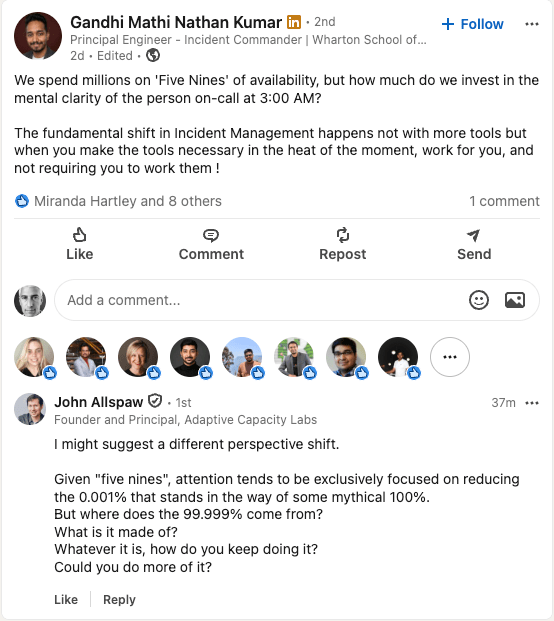 Here’s a recent comment on LinkedIn from John Allspaw, on a post by Gandhi Mathi Nathan Kumar about availability.