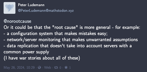 But your system isn’t down all of the time: in fact, it’s up more often than it’s down, even though these vulnerabilities are omnipresent. And the reason your system is up more than it’s down is that these vulnerabilities are not, by themselves, sufficient to take down a system. If you label these vulnerabilities as root causes, you make it impossible to understand to how your system actually succeeds. And if you don’t know how it succeeds, you can’t understand how it fails. You’re like the economist predicting recessions that don’t happen.