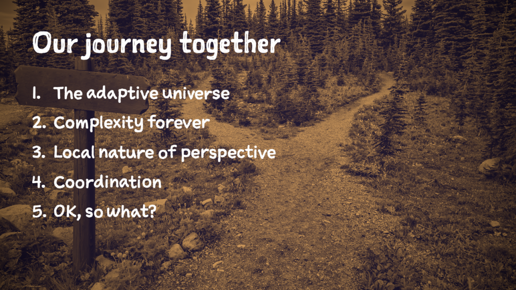 I lose interest in a talk if I can’t tell where the speaker is going with it, and so I try to frame my talk at the beginning: I give people an overview of how my talk is structure. This is the “tell them what you’re going to tell them” part of the dictum: “tell them what you’re going to tell them, tell them, tell them what you told them.”