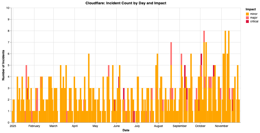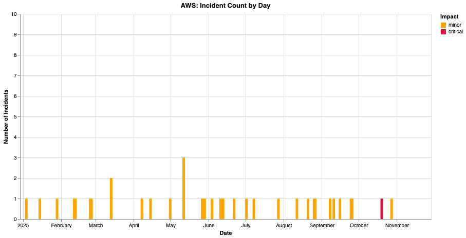 (AWS doesn’t classify impact, so I just marked the Oct 20 incident as critical and marked the others as minor, in order to make the visualization consistent with the Cloudflare graph).