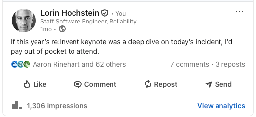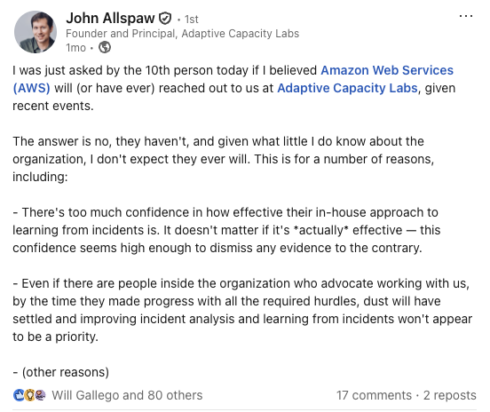 Last month, I made the following remark on LinkedIn about the incident that AWS experienced back in October.